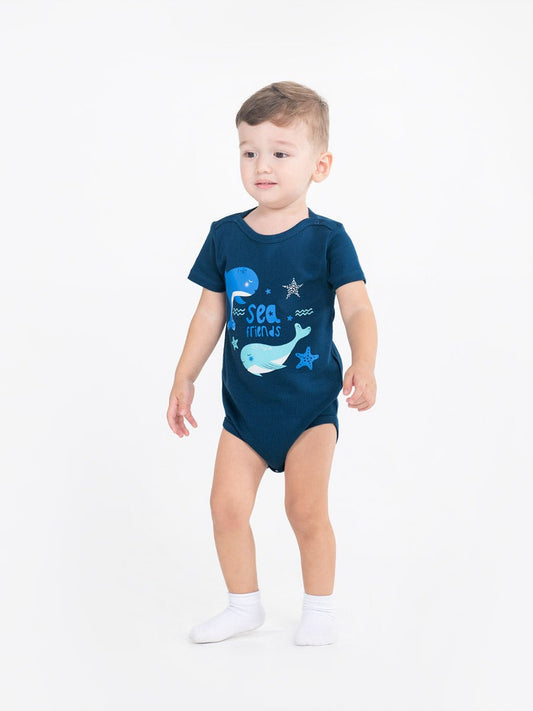 Newborn Baby Boys Dark Blue Bodysuit with Sea Friends Print